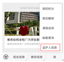 请各位同学关注“安徽工业大学教务处”微信平台,并绑定相关个人信息后,于2019年2月24日之前在平台上提交父母或监护人信息,至少填写一位父母或监护人信息。2月24日之后平台将不再接收信息提交。具体操作如下: