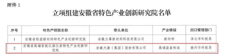 近日,安徽省科学技术厅对首批省级特色产业创新研究院进行立项公示,由安徽天康(集团)股份有限公司牵头、安徽工业大学电气与信息学院等单位联合共建的“安徽省高端智能仪器仪表特色产业创新研究院”成功获批。