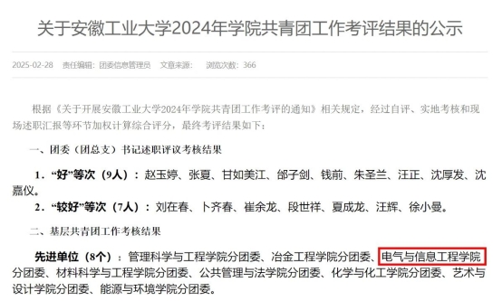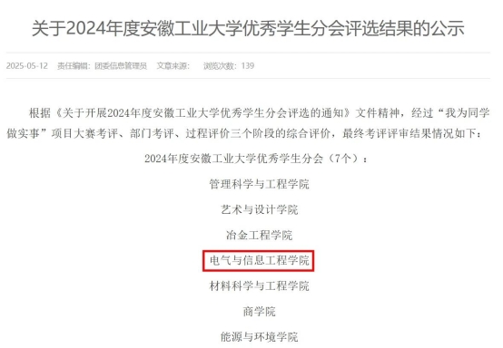 以奋斗为笔,以汗水为墨,学院在2024 年交出了一份令人瞩目的优异答卷!在安徽工业大学举办的 2024-2025学年校团委学生会工作考评中,我院斩获全部集体荣誉,每一项荣誉都闪耀着电院学子拼搏奋进的光芒,快来一起看看这些荣耀时刻吧!