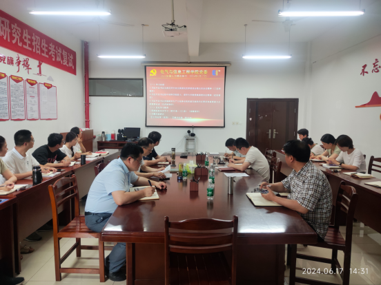 6月17日,学院党委理论学习中心组第七次集体学习暨党纪学习教育读书班在电气楼304室召开,学院党委书记丁忠利主持会议,学院领导班子、党支部书记、科级干部、工会主席和全体辅导员参加会议。