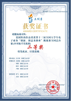 第十三届全国大学生电子商务“创新、创意及创业”挑战赛乡村振兴实战赛“延安杯”全国总决赛于2023年7月25日至7月27日在陕西省延安市黄陵县桥山中学举行,电气与信息工程学院王文泽、管理科学与工程学院刘泽前、商学院郑蕾、艺术与设计学院陈泽和商学院卢娜组建“超能陆战对队”(指导老师:李飞、沈浩)在高毅斌博士的带领下经过激烈角逐,最终斩获全国二等奖。