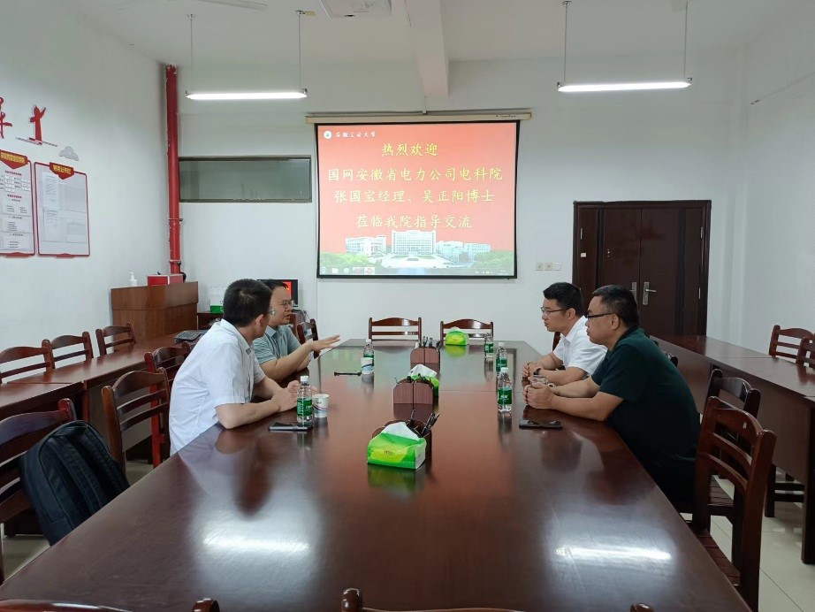 8月9日上午,国网安徽省电力公司电科院张国宝经理一行到我院进行交流。院长沈浩教授代表学院对来访客人表示热烈的欢迎,郑诗程教授参加会议。