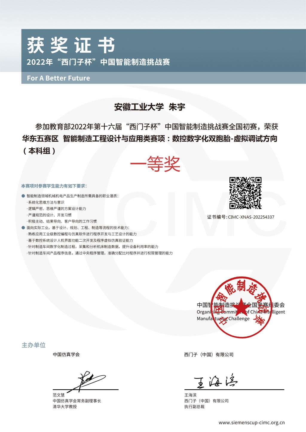 8月29日,教育部2022年第十六届CIMC“西门子杯”中国智能制造挑战赛(数控数字化双胞胎-虚拟调试方向)全国总决赛圆满落幕,由教师汪婧和朱争明指导的“加油向上队”(队员秦雨晴、张贺栋、朱宇)经过华东赛区选拔赛和全国总决赛,最终获得全国一等奖,这也是电气与信息工程学院在2022年里荣获的第4个国家级A类赛事一等奖。