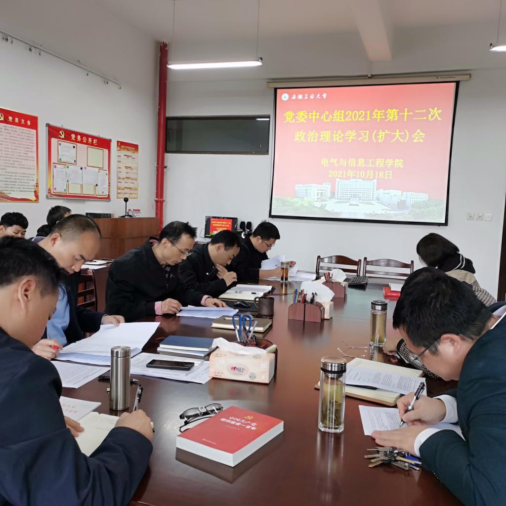10月18日下午,电气学院党委在电气楼304会议室召开理论学习中心组2021年第十二次学习(扩大)会,学院党政领导、党委委员、党支部书记、系室中心主任、科级干部、工会主席和全体辅导员参加了会议,院党委书记丁忠利主持会议。