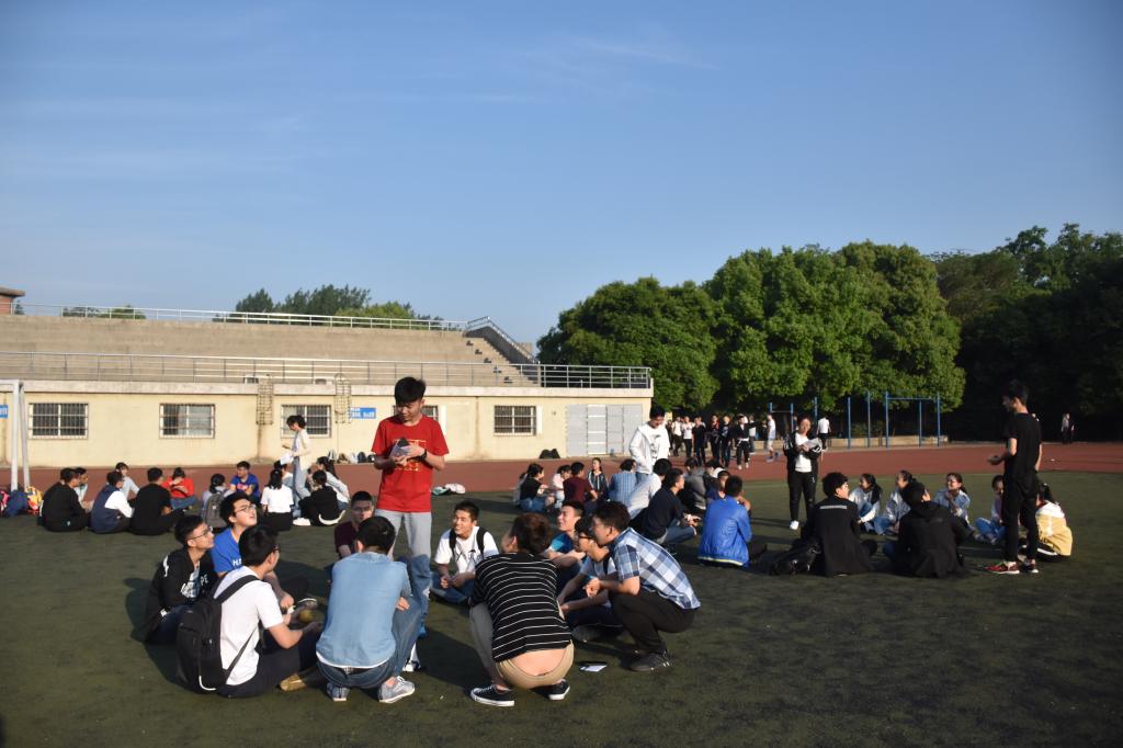 A、B两个班各自对应的小组分别组成一队、围成一圈,选一组组长作为游戏的主持人,在简要介绍游戏规则后,音乐响起,同学们依次传递手中的“花”,主持人喊停时,拿到“花”的幸运同学需回答问题,若答不出来则要选择真心话大冒险或者才艺表演。随着活动的进行,“中奖”的同学开始了一系列有趣的行为,有男生帮女生系鞋带的,有男生之间公主抱的,有对着太阳大喊“我最帅!”的,还有演唱歌曲《纤夫的爱》的,一个个生动精彩的环节给大家带来了很多欢乐,每个同学的脸上都洋溢着开心的笑容。