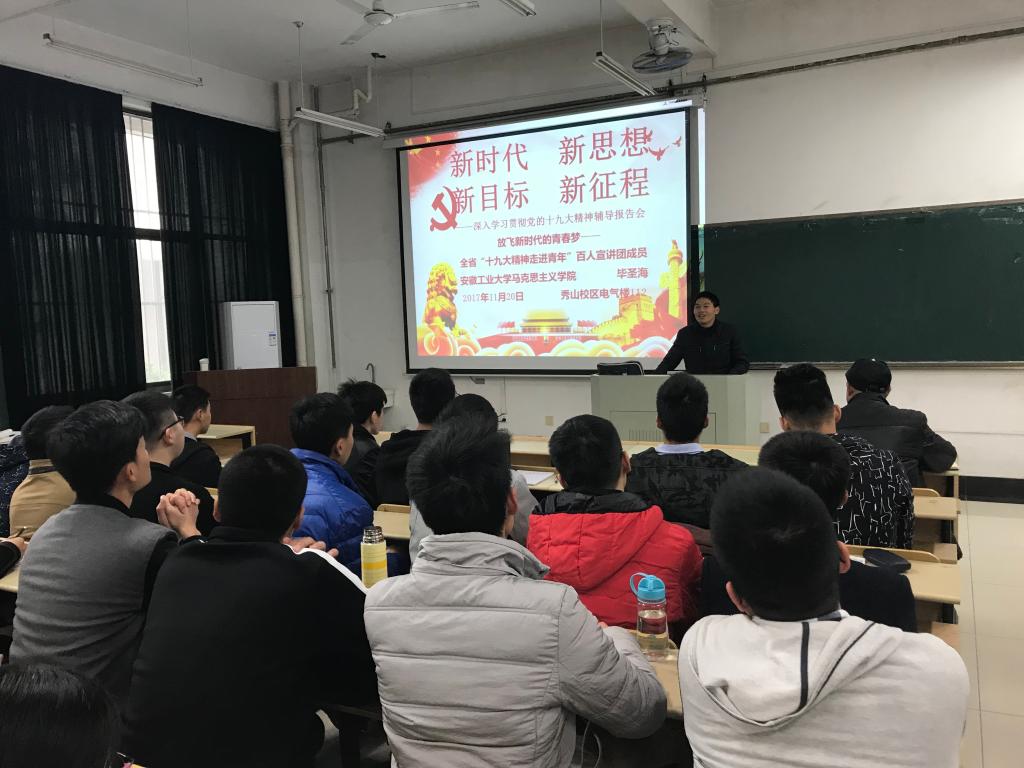 11月20日下午,电气学院组织举办深入学习贯彻党的十九大精神辅导报告会。主讲人是安徽省“十九大精神走进青年”百人宣讲团成员,安徽工业大学马克思主义学院毕圣海老师。学院研究生党员、本科生党员、发展对象参与学习。报告会由学院党委副书记、副院长郭宏主持。