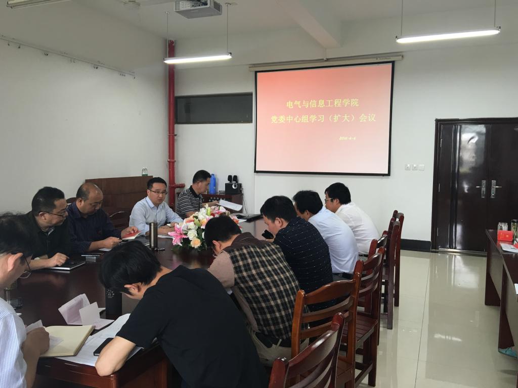 6月6日下午,电气与信息工程学院在电气楼304会议室召开党委中心组学习(扩大)会议,开展“两学一做”学习教育。全体院领导、系室中心主任、支部书记、全体科级干部及辅导员老师参加了学习会。
