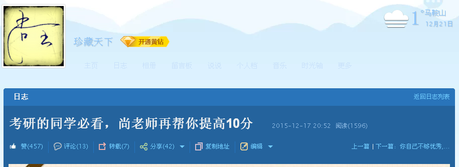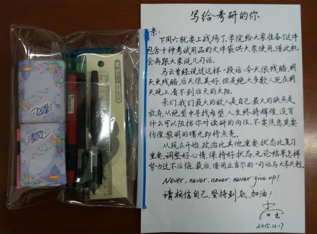 为了鼓励考研同学坚持复习、走进考场,12月17日,安徽工业大学电气与信息工程学院给每一位考研的学生准备了考研文具,并且附了一封勉励信。当晚,辅导员尚全老师在其QQ上写了一篇日志,给学生分析讲解了最后阶段的复习方案和答题技巧。当晚阅读量过1200,点赞超过400,被多家媒体转载,具体如下: