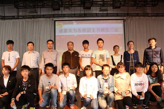 “三证”颁发仪式依照既定议程顺利进行。首先全体起立,奏唱国歌。四名新生着军训服装持团旗正步走上台,迎团旗,全体新生团员合唱中国共青团团歌。配乐诗朗诵《放飞青春》、一曲《光荣啊中国共青团》将大会推向了高潮。优秀学生代表丁淑琴分享学习经验。2015级各班团支书上台领取“三证”并与与会老师合影留念。最后,全体起立,重温入团誓词。