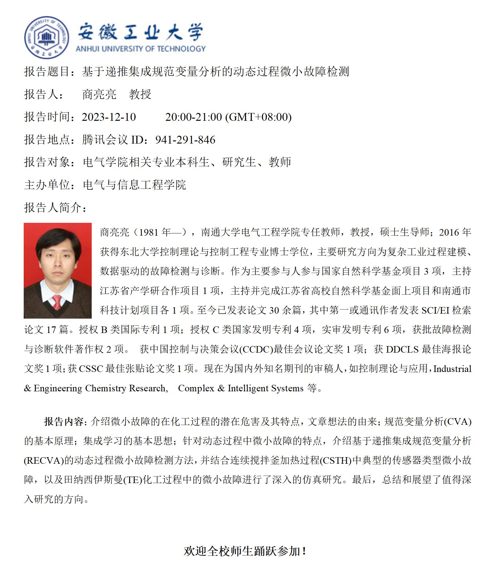 “谦之”学术讲坛之五十九-基于递推集成规范变量分析的动态过程微小故障检测