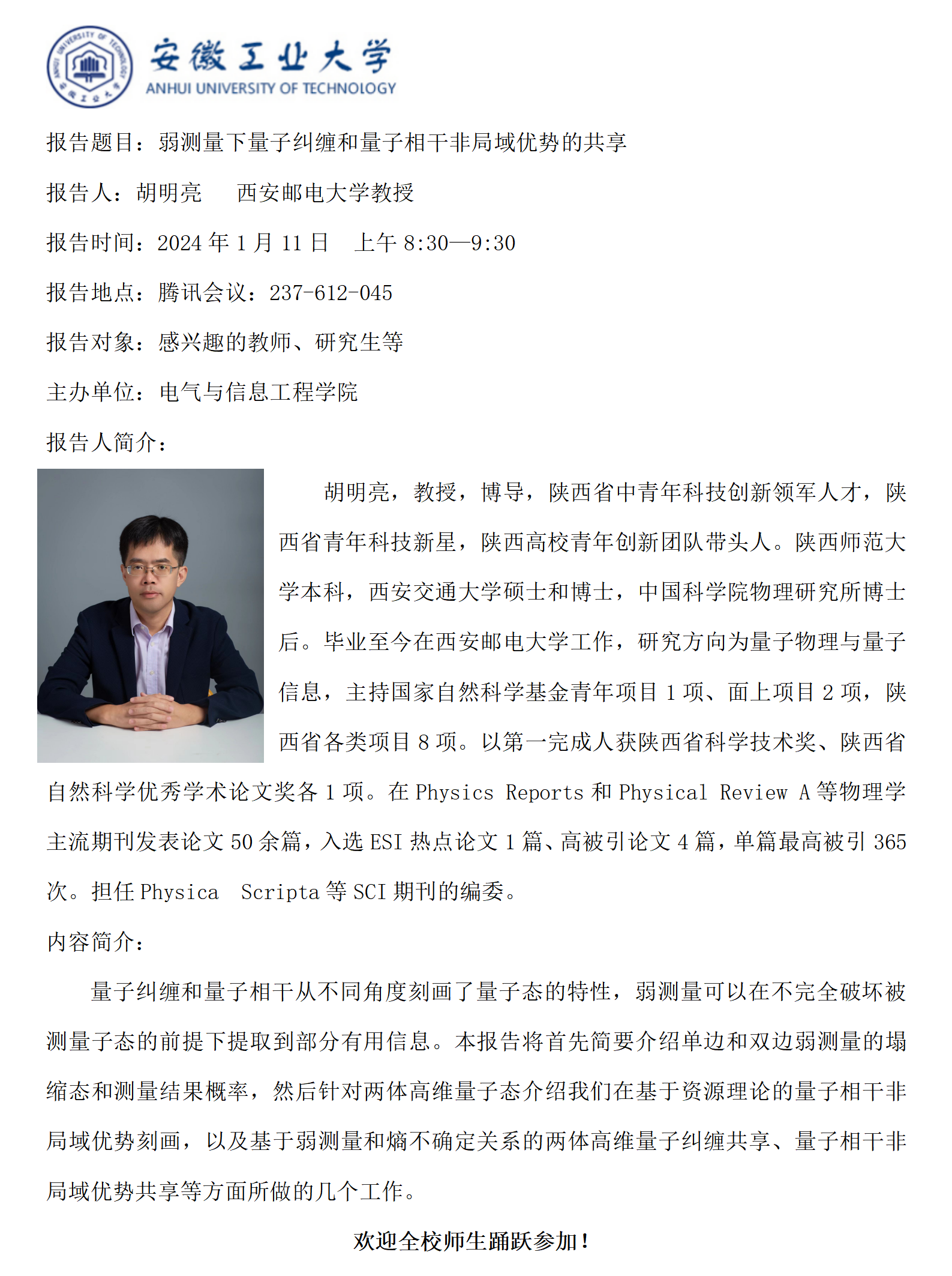 “谦之”学术讲坛之六十九-弱测量下量子纠缠和量子相干非局域优势的共享