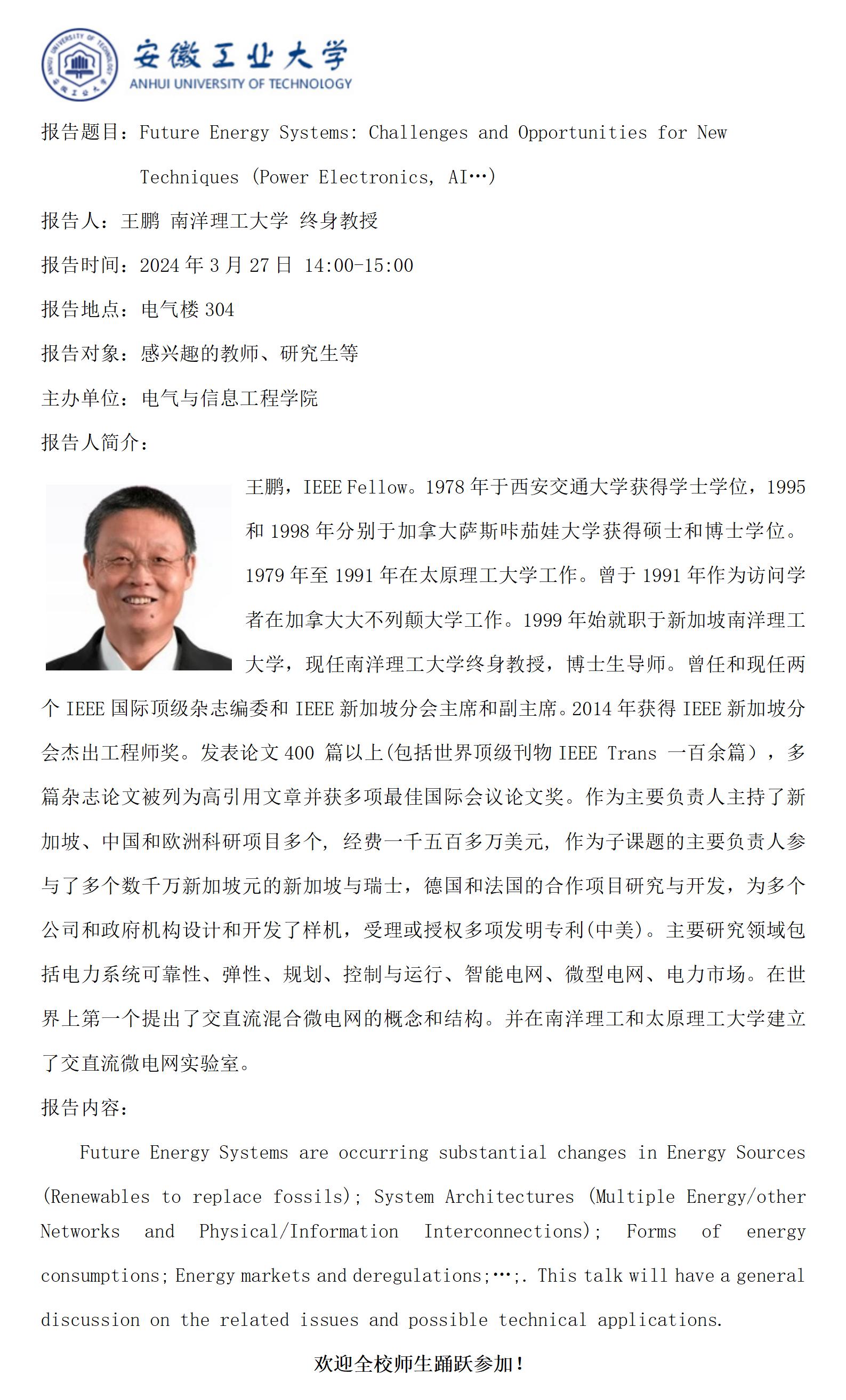 “谦之”学术讲坛之七十六-Future Energy Systems: Challenges and Opportunities for New