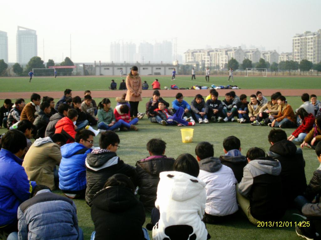 此次活动历时2个半小时,由许多积极团结、时尚新颖、富有朝气的心理游戏组成,如:“报到游戏”、“电波的速度”、“五毛和一块”、“缩小包围圆”、“地雷阵”、“007”等。其中“007”游戏获得大家一致好评,它的游戏规则为开始一人发音"零"随声任指一人,那人随即亦发音"零"再任指另外一人,第三个人则发音"柒",随声用手指作开枪状任指一人,"中枪"者不发音不作任何动作,但"中枪"者旁边左右两人则要发"啊"的声音,而扬手作投降状。出错者需要原地做5个俯卧撑。这个游戏锻炼了同学的反应能力、注意力及现场配合能力。活动过程中,每个同学都积极参与进来,同学们之间也配合十分默契,虽然天气寒冷,但同学们的热情不减,运动场上不时传出一阵阵欢声笑语。