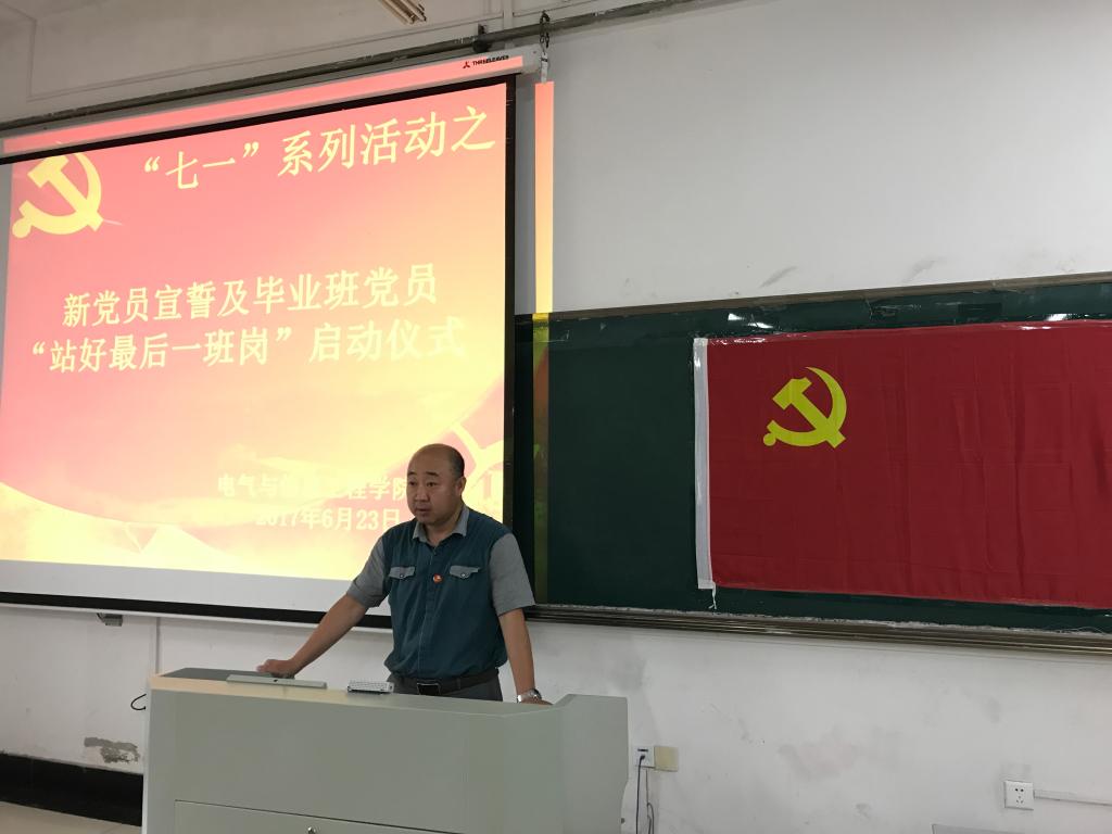 6月23日中午,电气学院举办新党员宣誓及毕业班党员“站好最后一班岗”启动仪式,院党委副书记、副院长郭宏、全体学生支部书记、全体学生党员参与活动。活动由陶源主持。