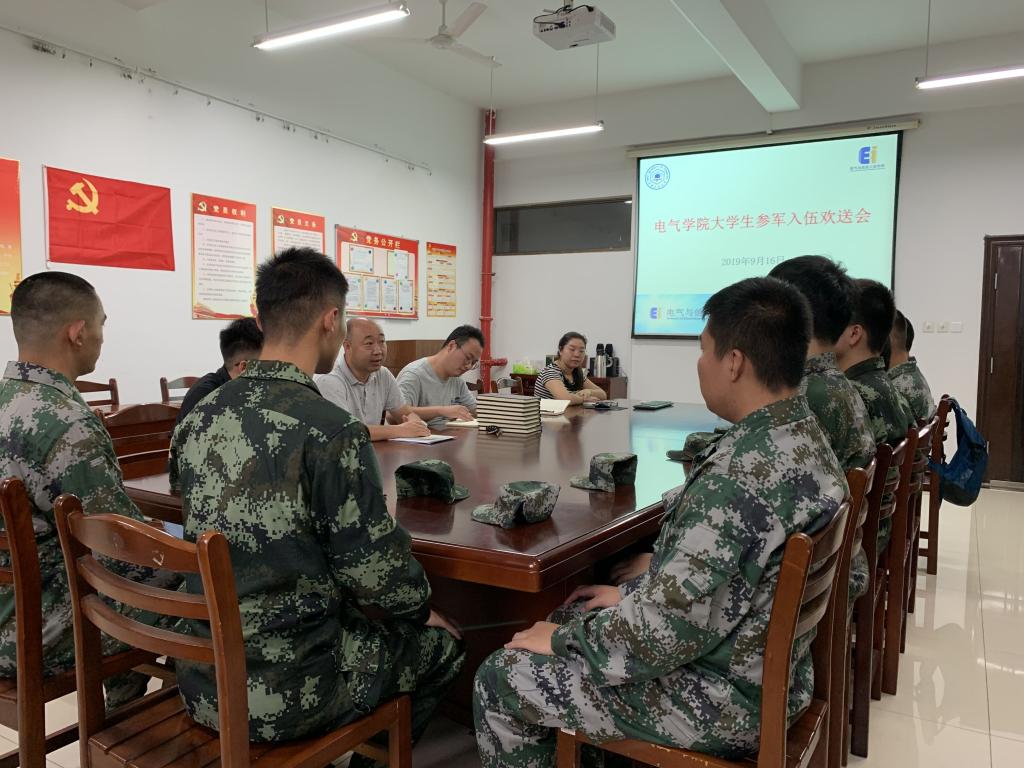 9月16日下午,电气学院举行2019年大学生参军入伍欢送会。院党委副书记、副院长郭宏,各年级辅导员,退伍老兵代表和本批新兵参加了会议。