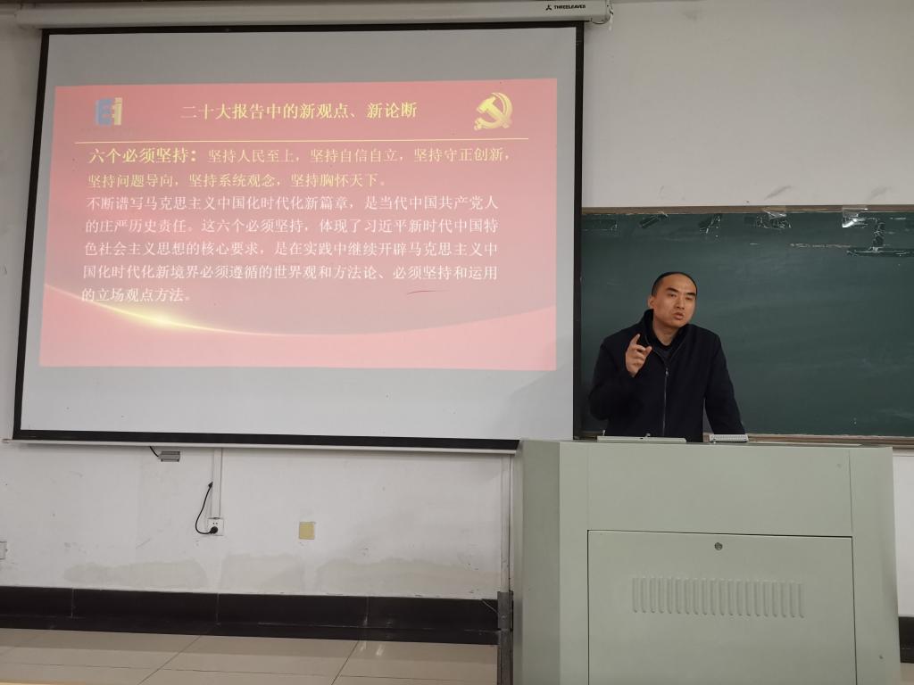 夏玉钦从党的二十大报告主题解读、二十大报告中的新观点、新论断释义、二十大报告指引未来怎么干三个部分进行阐述。他认为党的二十大报告从党和国家事业继往开来、中国特色社会主义前途命运、中华民族伟大复兴的战略高度,系统阐述了新时代坚持和发展中国特色社会主义的重大理论和实践问题,科学谋划了未来一个时期党和国家事业发展的目标任务和大政方针,当前和今后一个时期认真学习宣传贯彻党的二十大精神是全党全国的首要政治任务。呼吁大家要在全面学习、全面把握、全面落实上下功夫,深刻领悟党的二十大关于党和国家事业发展大政方针和战略部署的历史逻辑、理论逻辑、实践逻辑,自觉用党的二十大精神统一思想和行动,心往一处想、劲往一处使,坚定不移把党的二十大提出的目标任务落到实处。