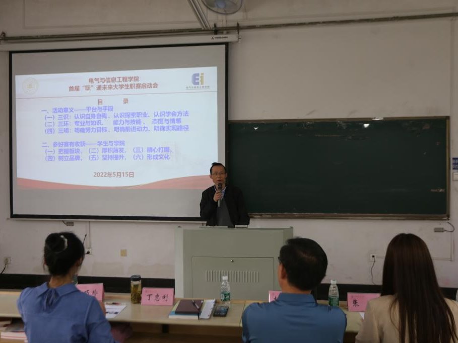 我院第一届“职“通未来职业规划设计大赛启动会暨赛事专题培训讲座于5月15日在电气楼顺利启动。本次讲座邀请到电气与信息工程学院党委书记丁忠利,学工部就业创业科科长李德利,安徽省第15届职业规划设计大赛一等奖获奖者、我校2022届材料成型及控制工程专业毕业生王巧玲为大家进行赛事解析。会议由19级辅导员张悦主持。