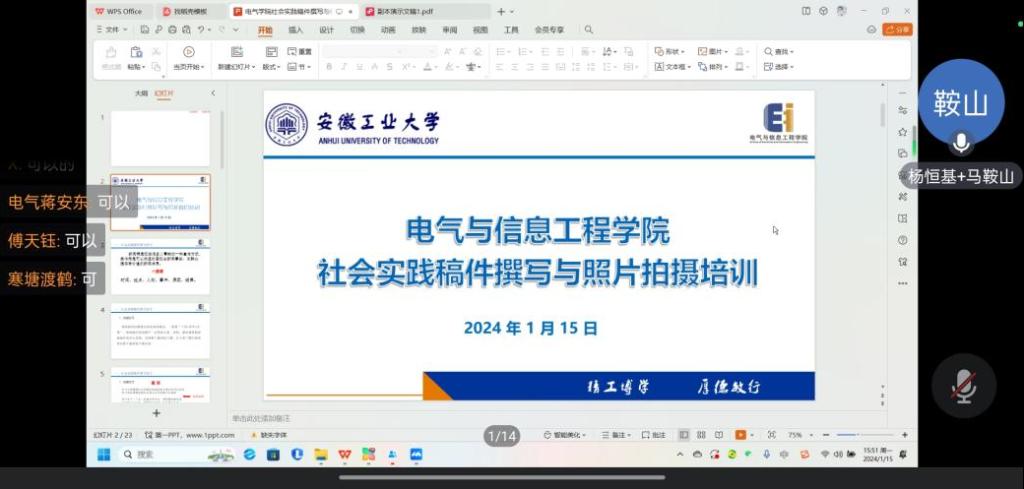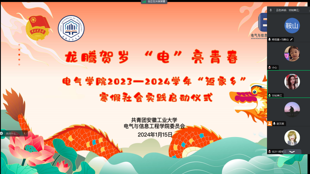 1月15日下午,电气学院于线上开展了2023-2024学年“返家乡”寒假社会实践启动仪式。学院团委书记甘如美江、团委副书记杨恒基、社会实践指导老师、团学骨干、全体寒假社会实践队员参加。