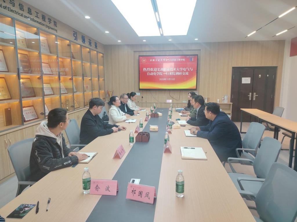 2025年11月13日下午,芜湖职业技术大学电气与自动化学院党总支副书记胡俊一行来我院开展调研交流活动。芜湖职业技术大学电气与自动化学院各教研室主任、博士代表及我院各系室主任、团委副书记、支部书记代表参加座谈交流,学院党委副书记、纪委书记、副院长孔洋波主持座谈会。