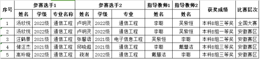 近日,第十一届“大唐杯”全国大学生新一代信息通信技术大赛圆满落幕,我院通信工程、电子信息等专业的学子们踊跃参赛,同学们在比赛中以扎实的理论基础知识、过硬的动手实践能力和密切的团队合作精神,在专业老师们的精心指导下,共荣获全国大赛三等奖1项、安徽赛区一等奖1项、二等奖1项和三等奖2项。